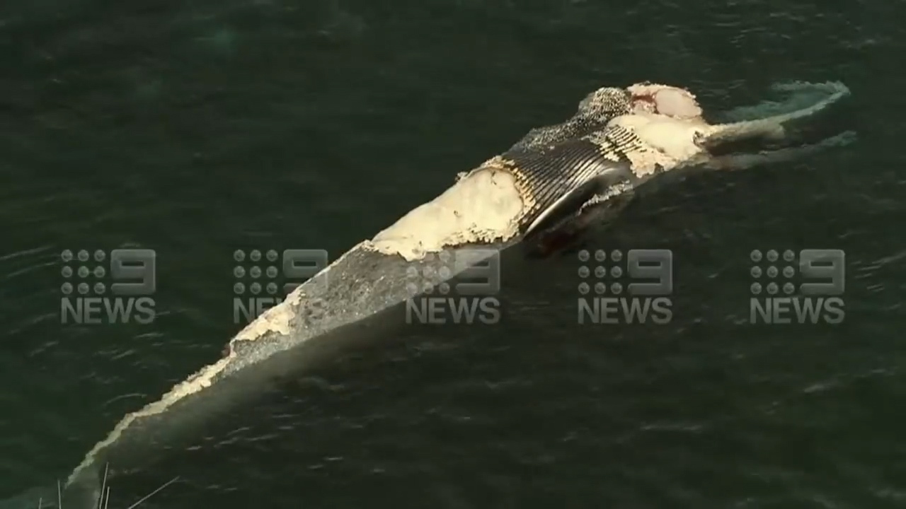 Dozens of tiger sharks and bronze whalers have been filmed tearing into the dead whale as it drifted north-east of Thomson Bay ferry jetty.