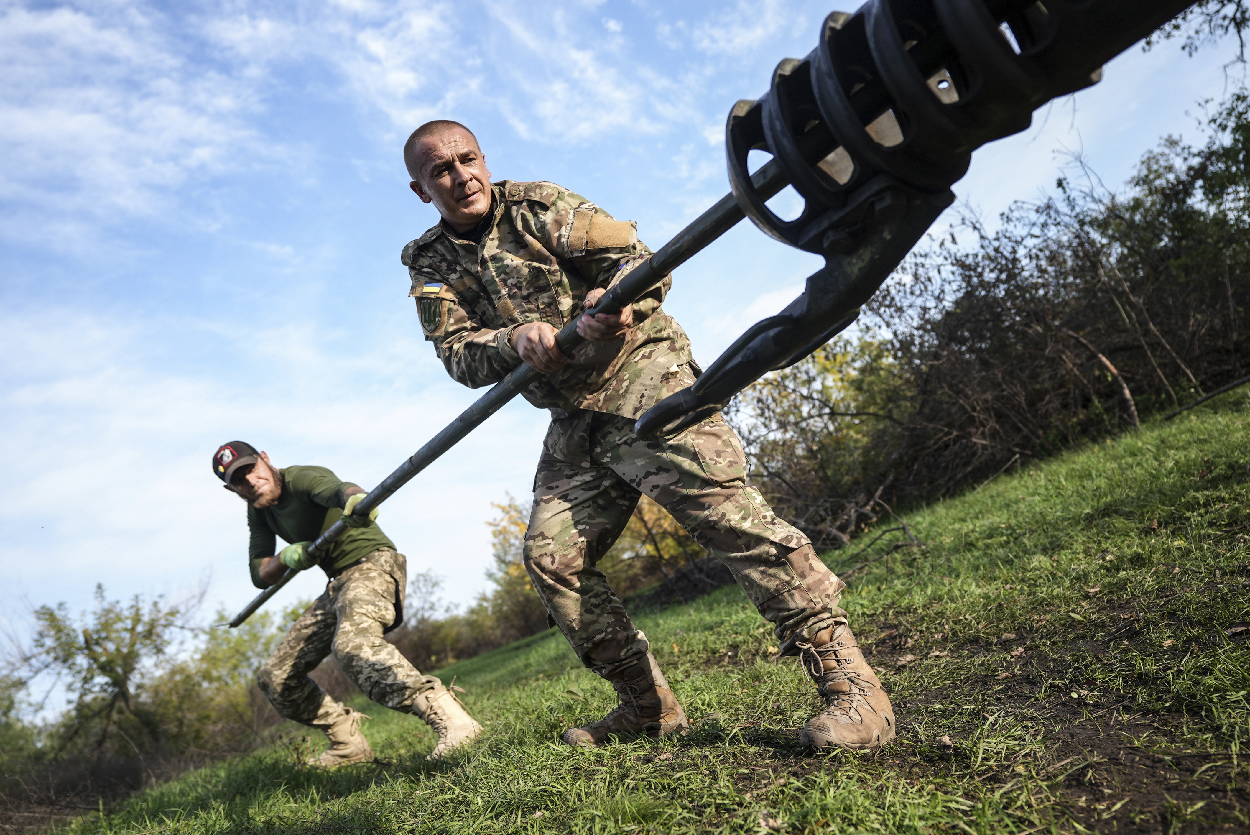 A Ukrainian flag flew above the statue as several apparently deactivated landmines lay beside it.