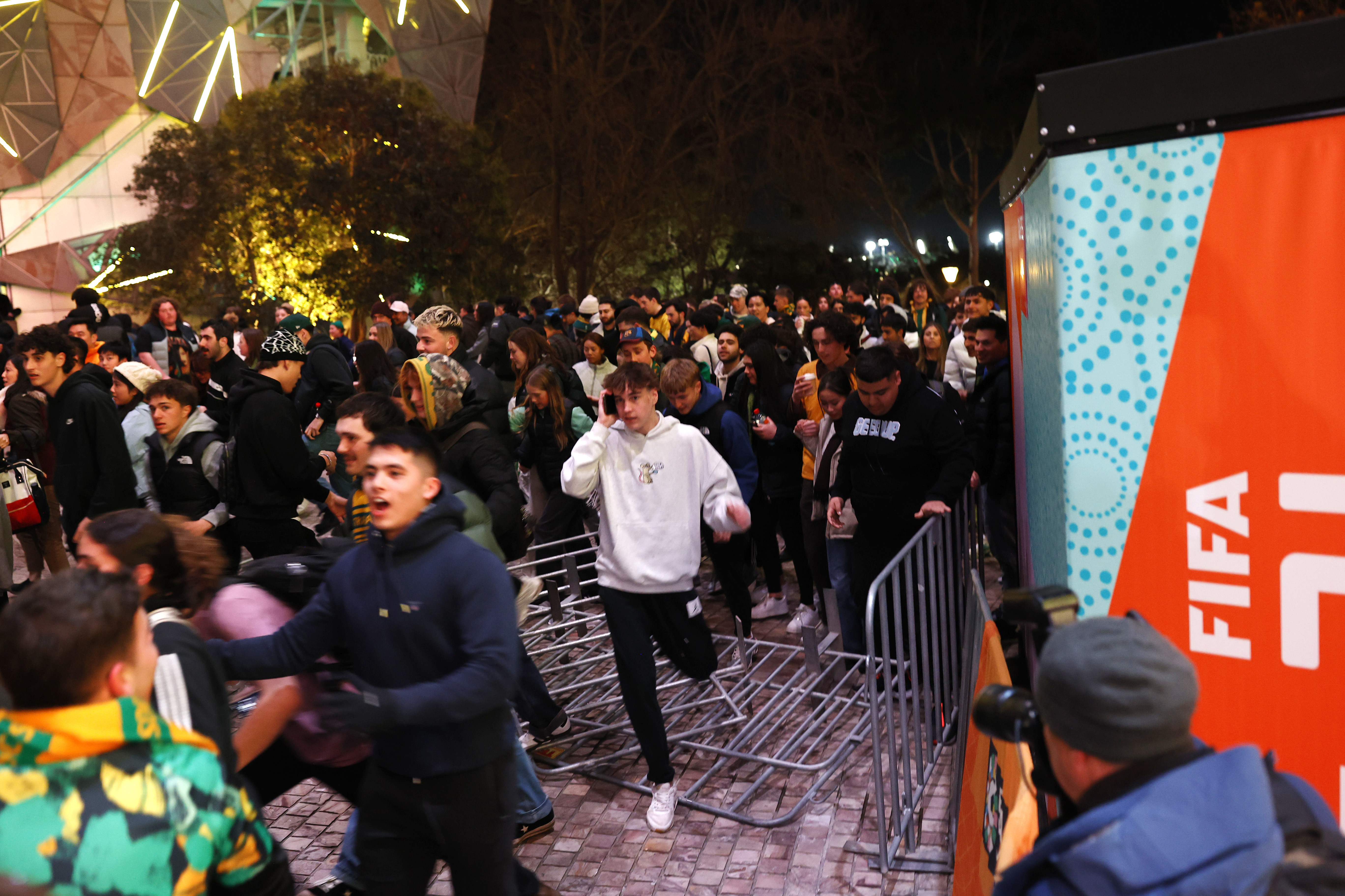 Fans have stormed through barriers at Melbourne's Federation Square after the live site reached capacity for the Matildas' World Cup semi-final against England.