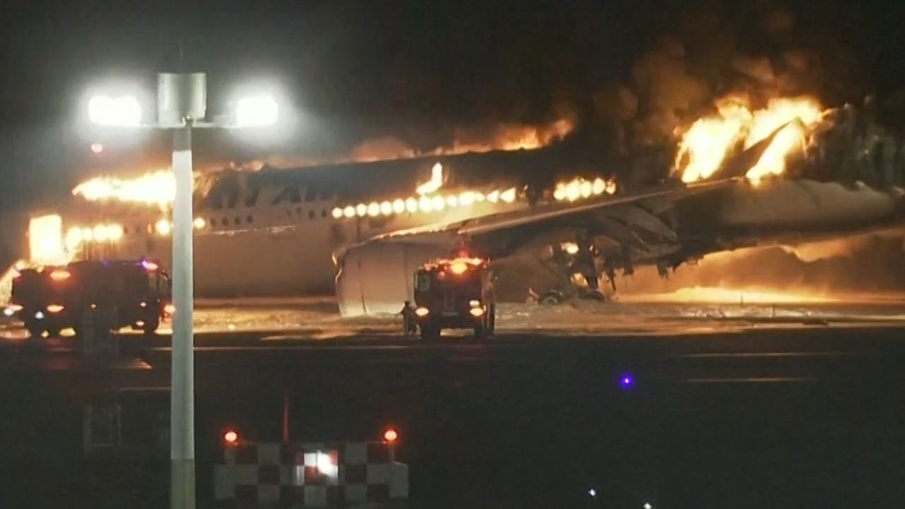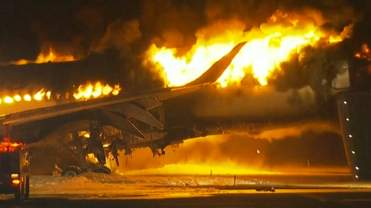 Local TV video showed a large eruption of fire and smoke from the side of the Japan Airlines plane as it taxied on a runway on Tuesday.