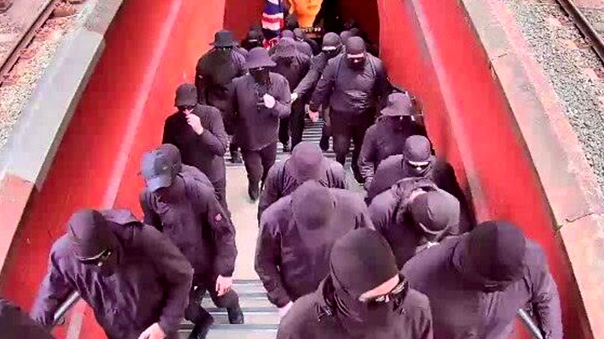 “The group all had their faces concealed and were carrying a number of items, including shields and a flag.