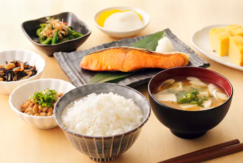 The typical Japanese diet is characterised by foods such as rice, fish and shellfish, and fruits (especially citrus fruits). But what makes this diet unique are traditional Japanese foods such as miso (fermented soybean paste), seaweed, pickles, green tea, soybeans, soybeans sprouts and mushrooms (such as shiitake). Notably, this diet is also characterised by low intake of red meat and coffee.