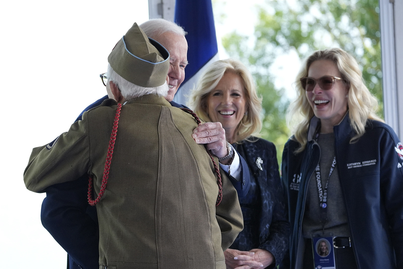 Earlier, Biden and first lady Jill Biden met with more than two dozen American veterans near Omaha Beach, where the fiercest D-Day fighting took place. Those who could stand were helped out of wheelchairs to pose for photos. Most shook hands with Biden or saluted; one hugged him.